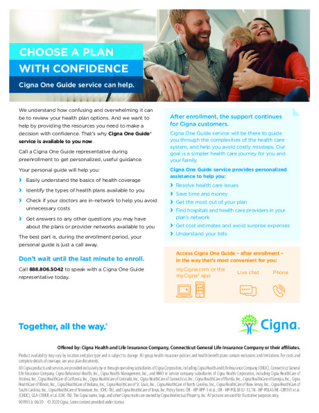 We understand how confusing and overwhelming it can be to review your health plan options. And we want to help by providing the resources you need to make a decision with confidence. That’s why Cigna One Guide® service is available to you now.